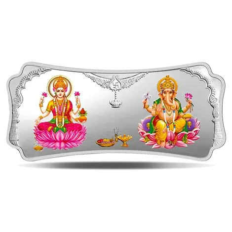 Get a beautifully crafted 50gm Goddess Lakshmi and Lord Ganesha Silver Bar. In the Divine Incarnation of physical beauty, fertility, luxury, and prosperity, Goddess Lakshmi is portrayed with her four arms that together represent cosmic omniscience, as well as perfection and freedom from bondage or limitations. Lord Ganesha bestows blessings of prosperity upon humankind, but his portrayal also symbolizes caution, balance, humility, and prudence. The purest silver bar beautifully captures the two divinities in timeless perfection.